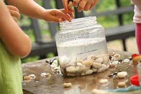 These activities evolve through play, if children are playing with water ensure that suitable materials are provided so they can begin to experiment in this way. Filling a container to the brim with water, and dropping in stones so that the children will see the water overflow, and begin to determine the stones took up some space – i.e. displacement. Regardless of whether the terminology is evident, the concept is beginning to emerge as the child will consider what has happened, and often ask questions about why. Children who have more experience with this will be better able to think critically, and evaluate the results.